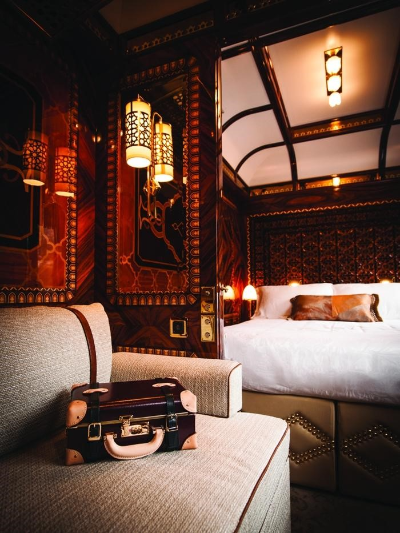 The carriages are originals from the 1920s, adorned with marquetry by the art deco master René Prou and etched glass panels by René Lalique. The train comprises sleeping cars dating back to the 1920s and 1930s and four elegant day cars, including the three sumptuous dining cars, L’Oriental, Etoile Du Nord, Côte d’Azur and the boutique corner. Passengers can choose between twin cabins or a suite cabin, consisting of two connecting twin cabins that can be used as a living area and the other as a sleeping area. Almost dazzling is the impact of one of the six “large suites” with an interior inspired by the cities of Paris, Venice, Istanbul, Vienna, Budapest and Prague, with large spaces, double beds, living rooms and private bathrooms. A time machine on rails allows you to go back and live a truly incredible experience.