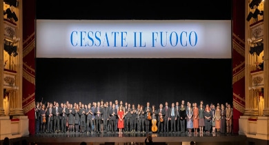 La Scala launches its appeal for peace in the Middle East with the banner: “Ceasefire”.