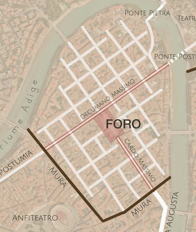 Today the liveliest spot in Verona, Piazza delle Erbe was once the forum of Roman Verona. The Romans laid out the city according to a typical Roman urban plan: a regular grid of intersecting streets enclosed by walls. At its center stood the forum—the heart of every Roman city.